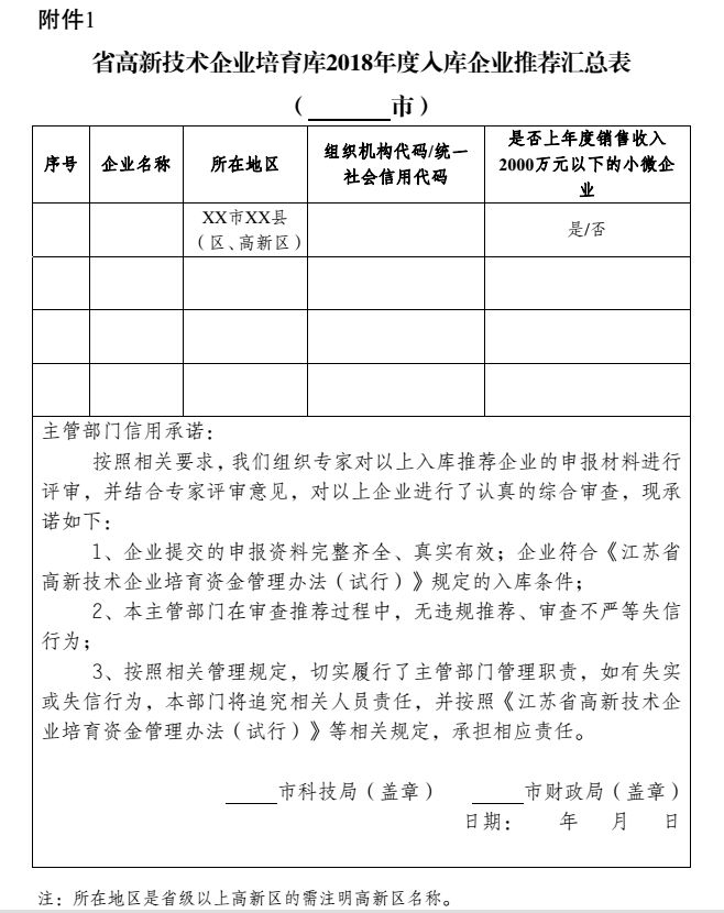 為深入貫徹黨的十九大和省委十三屆三次全會(huì)精神,全面落實(shí)高質(zhì)量發(fā)展要求和“兩聚一高”戰(zhàn)略部署,進(jìn)一步加快高新技術(shù)企業(yè)培育工作,深入實(shí)施高新技術(shù)企業(yè)培育“小升高”計(jì)劃,根據(jù)省財(cái)政廳、科技廳《關(guān)于印發(fā)〈江蘇省高新技術(shù)企業(yè)培育資金管理辦法(試行)〉的通知》(蘇財(cái)規(guī)〔2017〕20號(hào),以下簡(jiǎn)稱《管理辦法》)要求,現(xiàn)就江蘇省高新技術(shù)企業(yè)培育庫(kù)2018年度入庫(kù)企業(yè)申報(bào)工作有關(guān)事項(xiàng)通知如下: