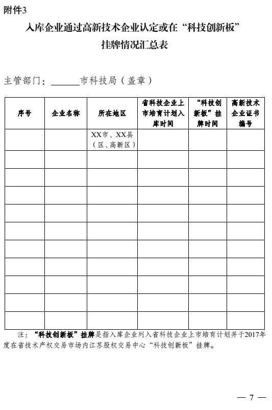 2、各設(shè)區(qū)市科技部門(mén)會(huì)同同級(jí)財(cái)政部門(mén)于5月15日前聯(lián)合行文將推薦入庫(kù)企業(yè)名單(含電子版表格)、地方高新技術(shù)企業(yè)培育資金支持納入省2017年度入庫(kù)企業(yè)情況說(shuō)明、地方培育資金下達(dá)文件、地方培育資金管理辦法或?qū)嵤┘?xì)則、入庫(kù)企業(yè)通過(guò)高新技術(shù)企業(yè)認(rèn)定或列入省科技企業(yè)上市培育計(jì)劃并于2017年度在省技術(shù)產(chǎn)權(quán)交易市場(chǎng)內(nèi)江蘇股權(quán)交易中心“科技創(chuàng)新板”掛牌情況匯總表(見(jiàn)附件1、2、3)等材料,一式兩份統(tǒng)一報(bào)送至委托受理單位——省生產(chǎn)力促進(jìn)中心。企業(yè)向所在地縣(市)、高新區(qū)科技部門(mén)提交申報(bào)材料的截止時(shí)間以地方通知為準(zhǔn)。