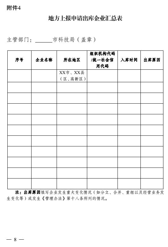 5、各設(shè)區(qū)市科技部門(mén)要加強(qiáng)對(duì)入庫(kù)企業(yè)的跟蹤與監(jiān)督,對(duì)發(fā)生重大變化(如分立、合并、重組以及經(jīng)營(yíng)業(yè)務(wù)發(fā)生變化等)后不符合入庫(kù)條件的,或在入庫(kù)申請(qǐng)過(guò)程中存在嚴(yán)重弄虛作假行為的,以及培育期間發(fā)生重大安全、重大質(zhì)量事故或有嚴(yán)重環(huán)境違法行為的,及時(shí)填報(bào)“地方上報(bào)申請(qǐng)出庫(kù)企業(yè)匯總表”(見(jiàn)附件4),并正式行文報(bào)請(qǐng)省科技廳予以出庫(kù),取消其培育資格。