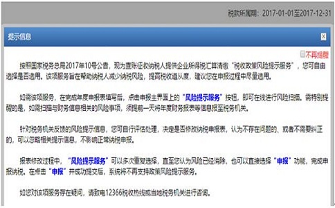 1、 您在申報頁面點擊“所得稅年度A類申報”后,系統(tǒng)將給出風(fēng)險提示服務(wù)相關(guān)提示語。