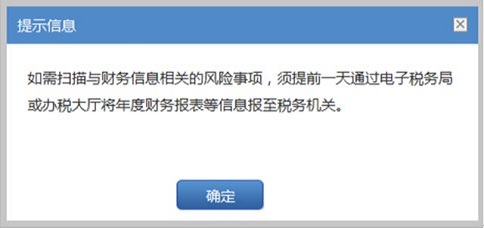3、系統(tǒng)將首先給出前置條件提示信息:如需掃描與財務(wù)信息相關(guān)的風(fēng)險事項,須提前一天將年度財務(wù)報表等信息報至稅務(wù)機(jī)關(guān)。