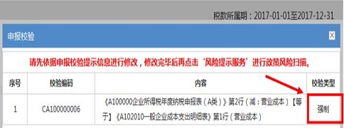 4、點擊*三步提示框中的“確定”按鈕后如果跳出申報強(qiáng)制校驗信息,請您先依據(jù)申報校驗提示信息進(jìn)行修改,修改完畢后可再次點擊“風(fēng)險提示服務(wù)”,系統(tǒng)將為您進(jìn)行政策風(fēng)險掃描。