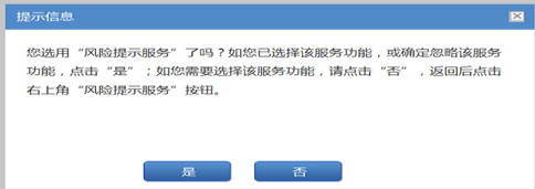 8、 點擊“申報”按鈕再次給出風(fēng)險提示服務(wù)的相關(guān)提示,選擇“是”繼續(xù)申報,選擇“否”則返回列表頁面,繼續(xù)選用“風(fēng)險提示服務(wù)”后再申報。