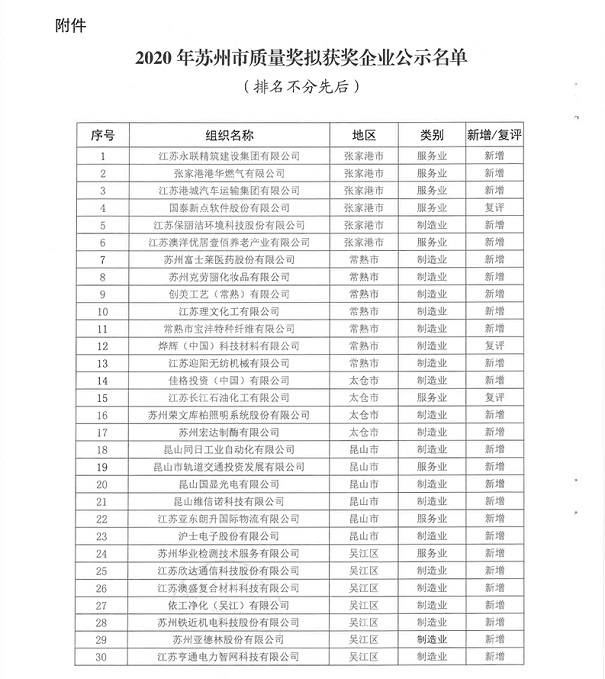 2020年蘇州市質(zhì)量獎評定結(jié)果公示「智為銘略轉(zhuǎn)發(fā)」